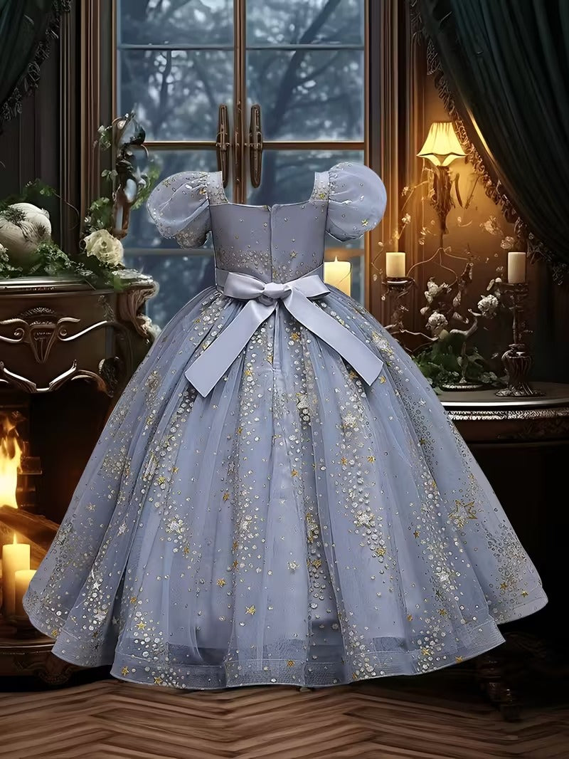 Elegant Blue Princess Ball Gown for Girls – Glitter Star Embroidered Party Dress